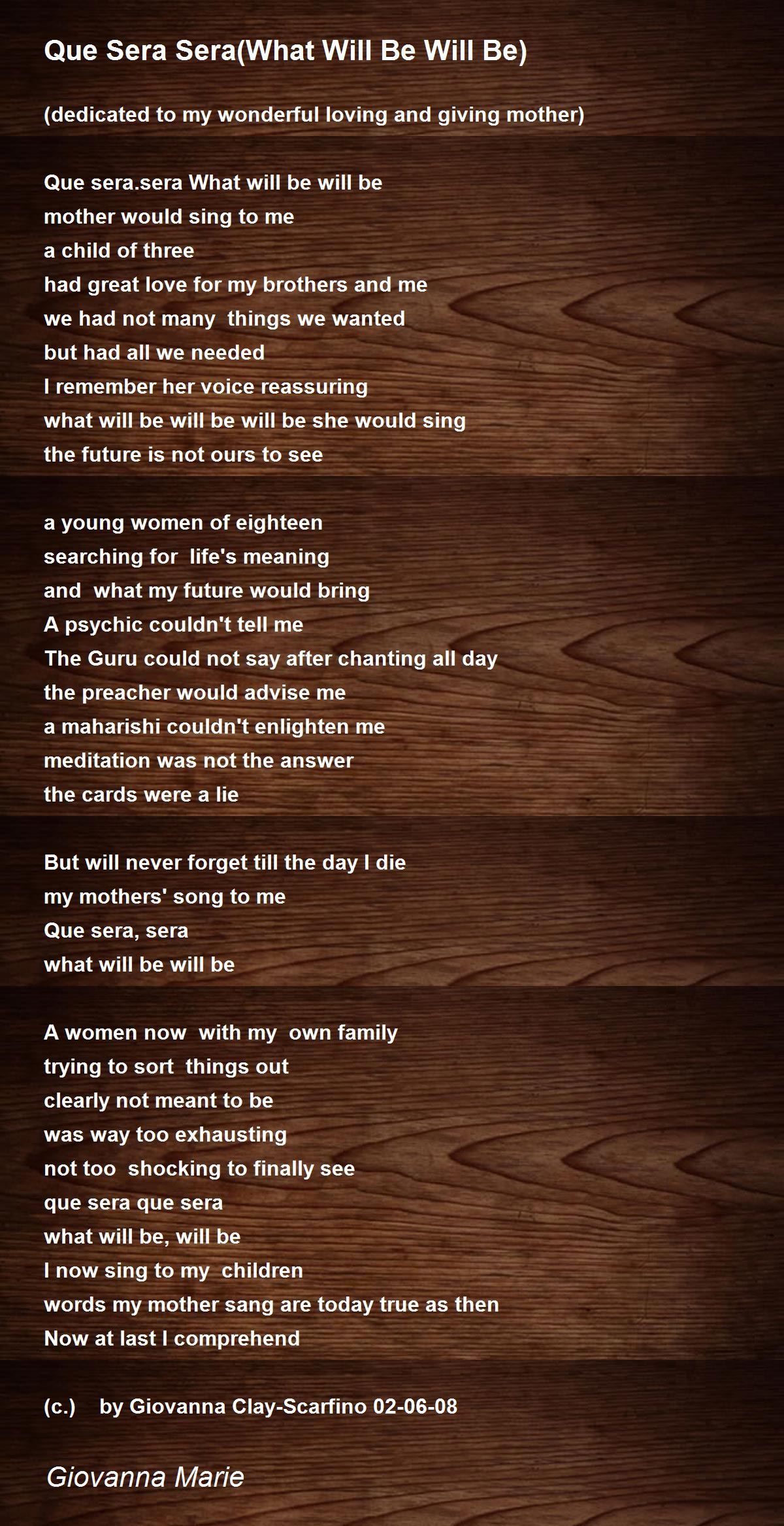 Que Sera Sera What Will Be Will Be Poem By Giovanna Marie Poem Hunter